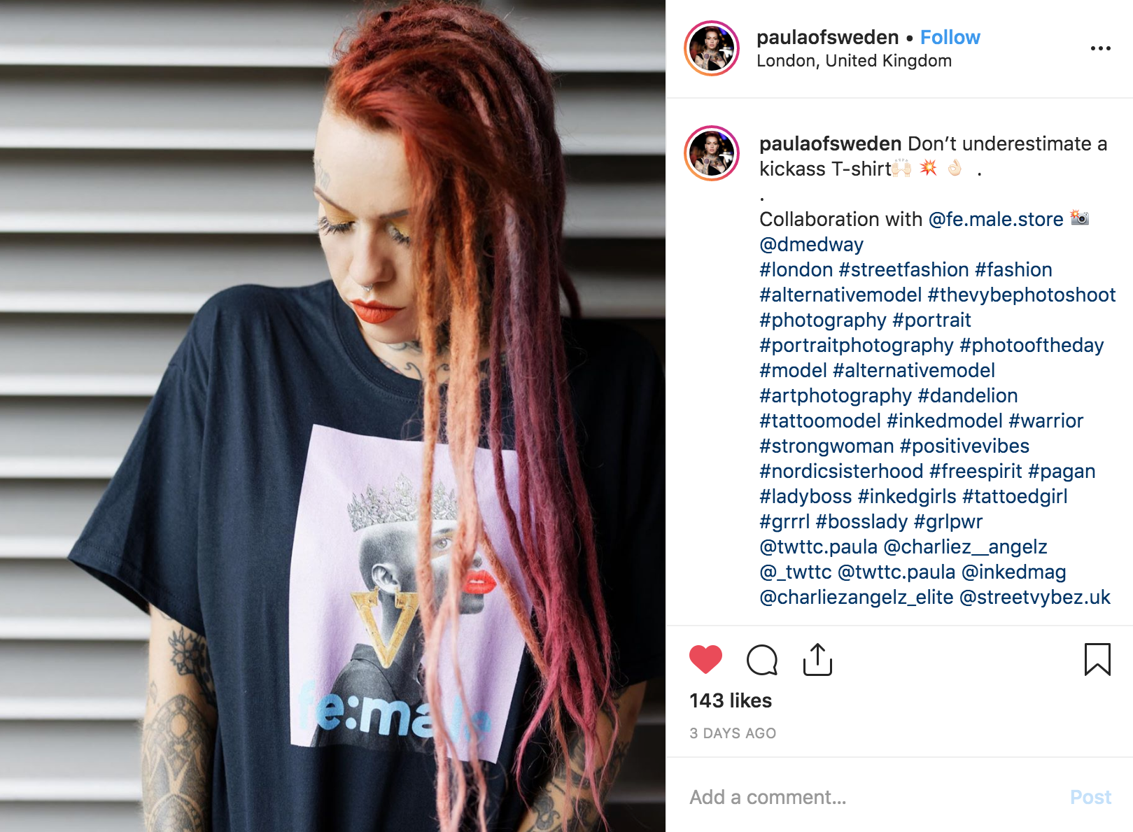 fe:male representerades på London fashion week 2018 med egendesignat set och halsband som Don’t call me baby, Not yours och fe:male i guld.